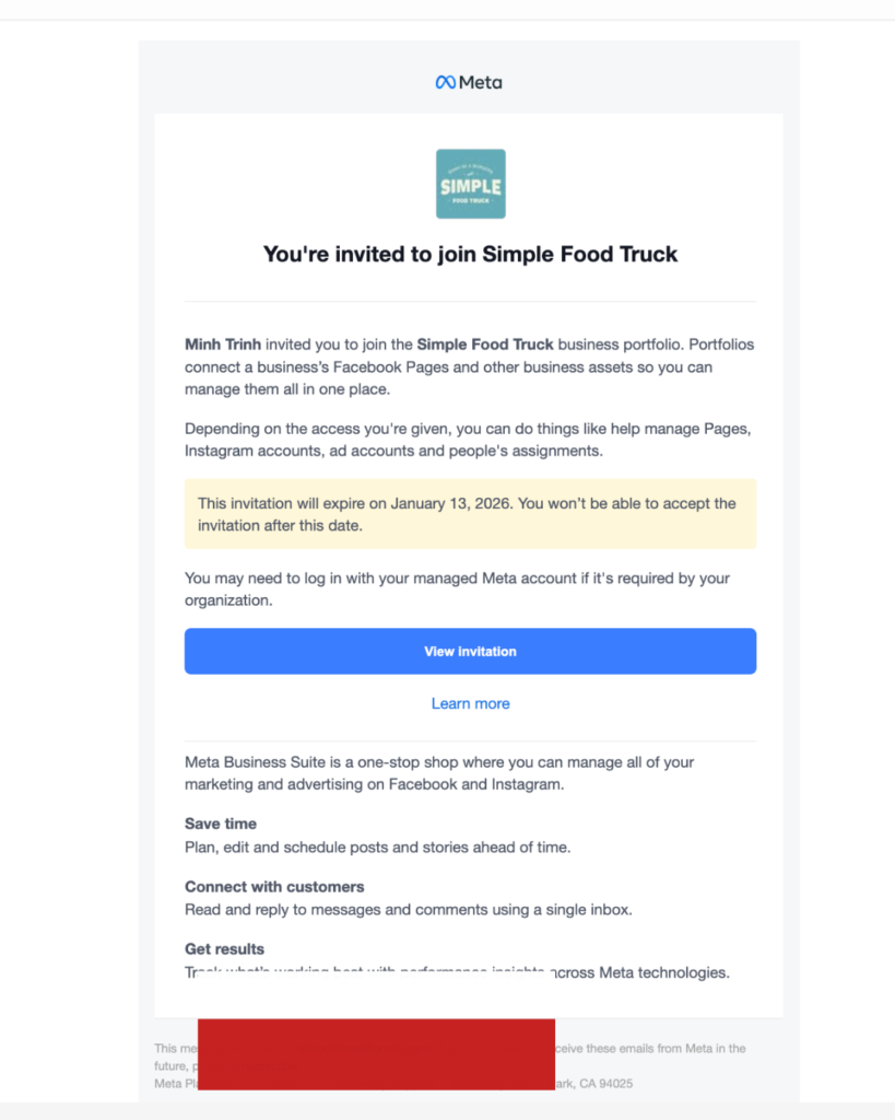 Over the last few months, a wave of “Facebook Business” invitations has been hitting inboxes with subjects like “Action required” and “You’re invited to join our business portfolio.” One example is an invite to join a “Simple Food Truck business portfolio” that sends you to business.invitepagemanage.com, a domain that does not belong to Meta and fits a known phishing pattern used to hijack pages and ad accounts.